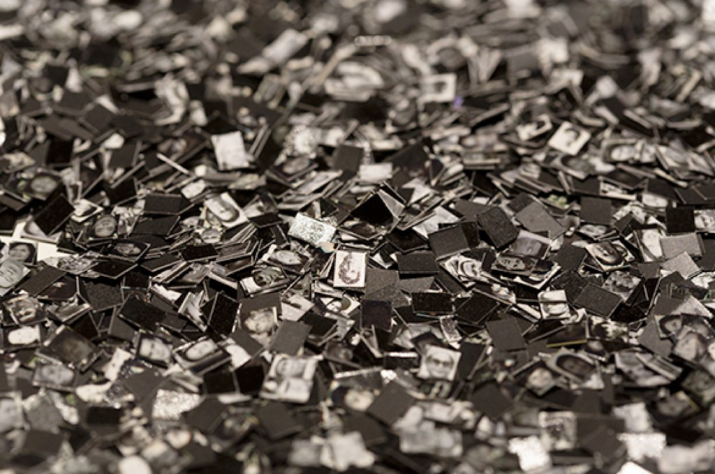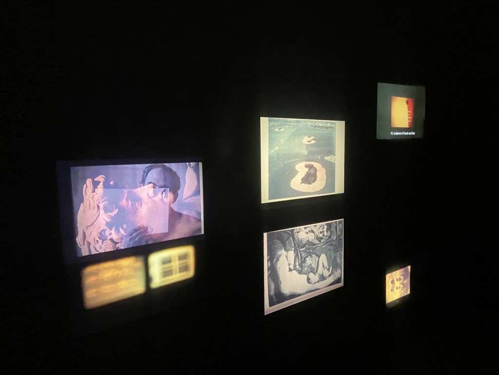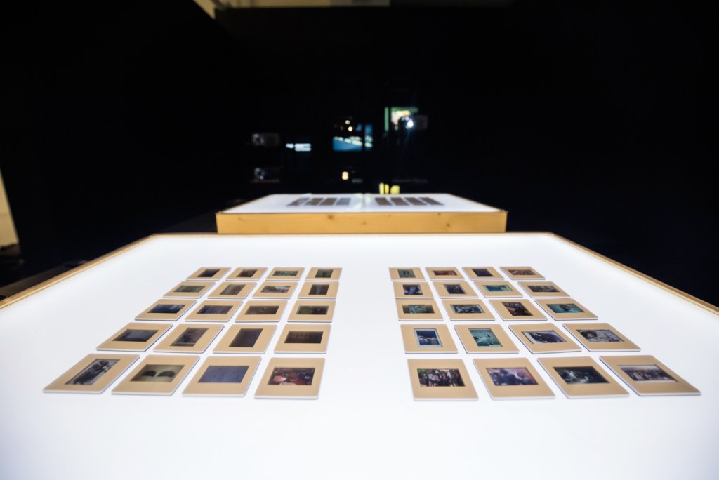 9 slide projectors( auto timer), tiny photographs on table with magnifiers.